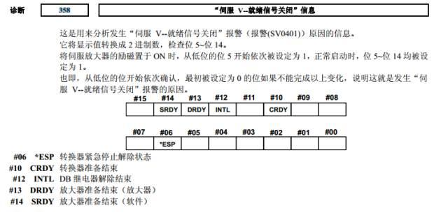 例如:診斷358=1441,轉換為二進制為10110100001,從第5位開始排查,第6位為0,確認首先應排查急停相關接線等。
